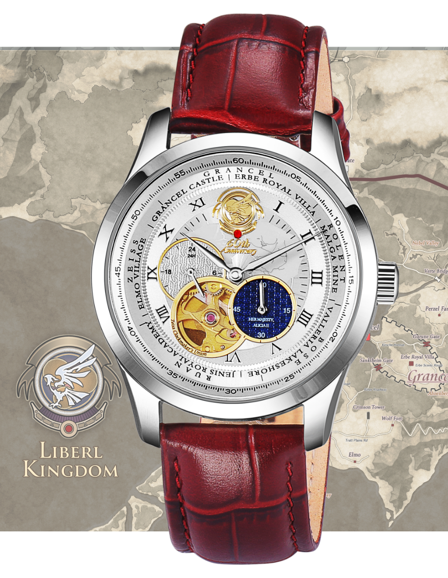 文字盤中央にはリベール王国の地図をレイアウト。周囲にはヨシュアとエステルが巡った各地――グランセル、ロレント、ボース、ルーアン、ツァイスの地名を刻印。6時位置には女王のドレス刺繍を思わせるギョーシェ模様と「HER MAJESTY, ALICIA」の文字が浮かびます。裏蓋はスケルトン仕様で機械式の鼓動がのぞき、限定200点のエディションナンバーが記された特別な一本です。